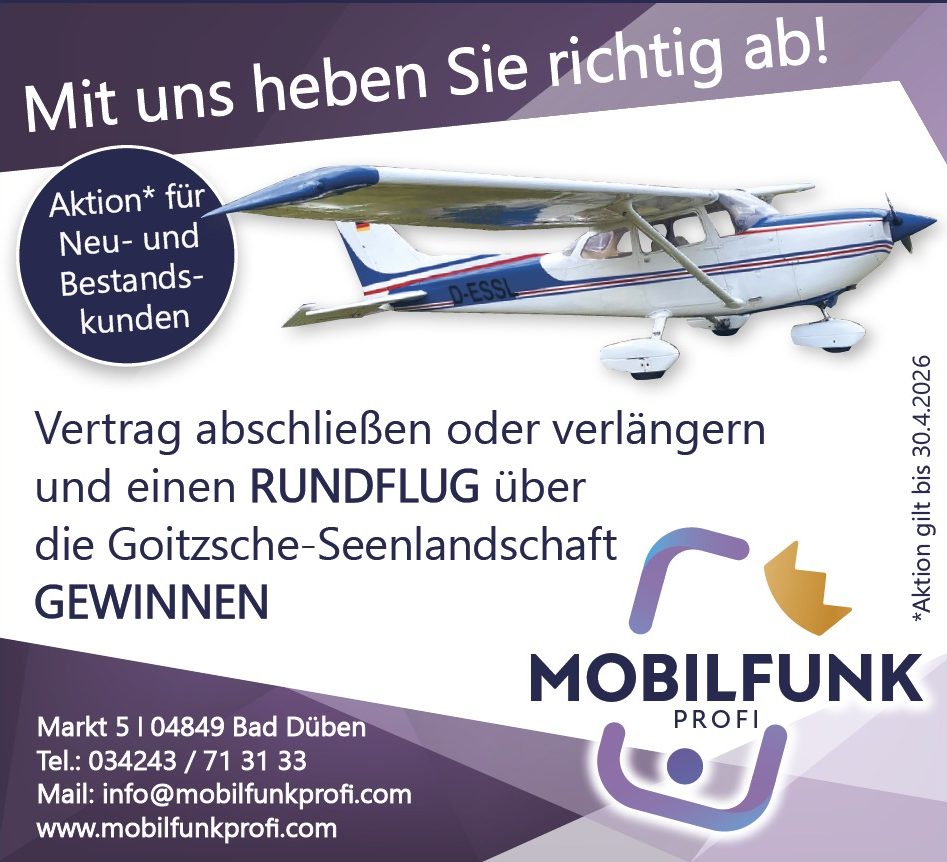 Mit uns heben Sie jetzt richtig ab! Neuvertrag abschließen oder Vertrag verlängern und die Chance auf einen Rundflug über die Goitzsche-Seenlandschaft gewinnen.